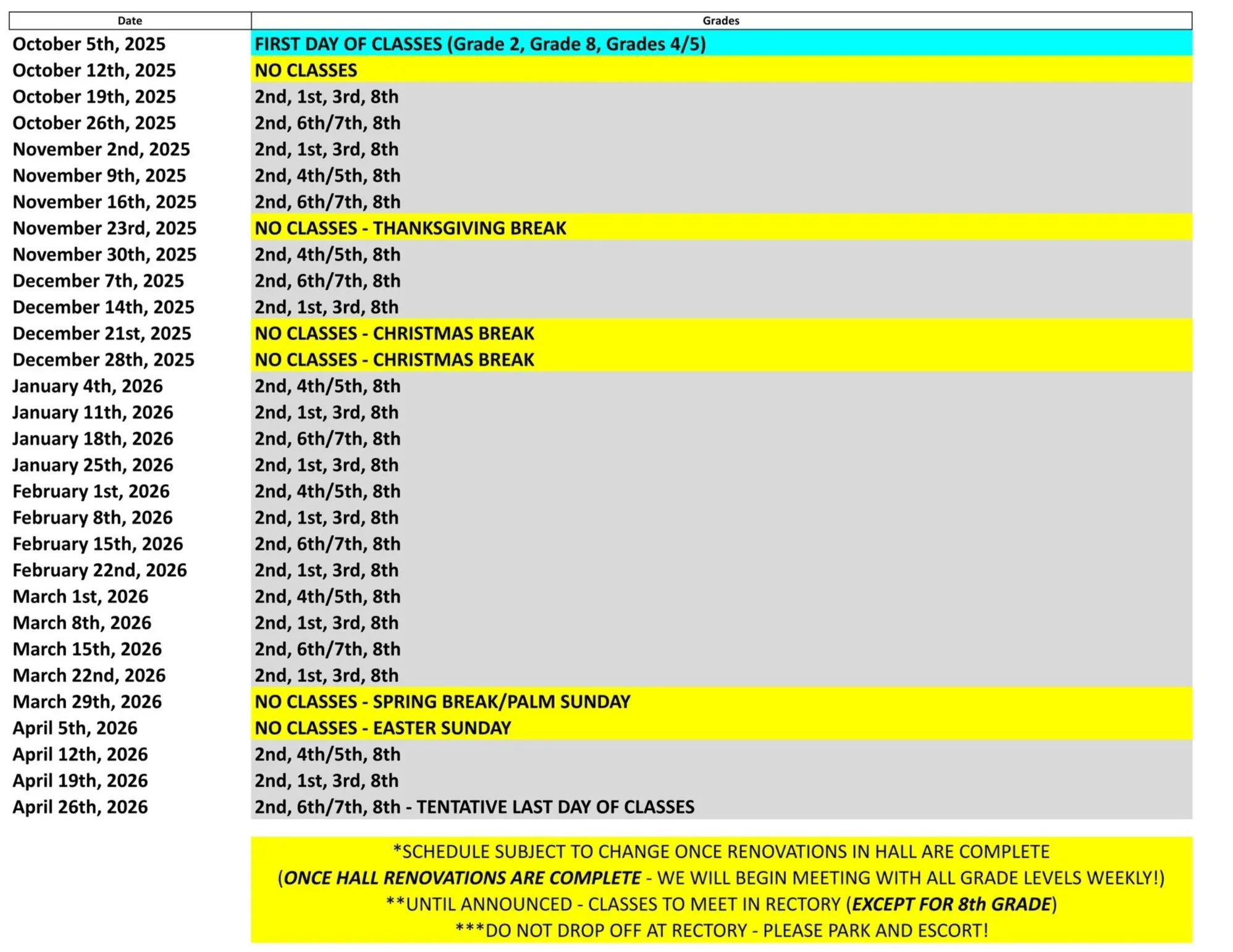 Classes begin Sunday, October 5, 2025. Please use the schedule below to see when your child(ren)’s grade(s) will meet.